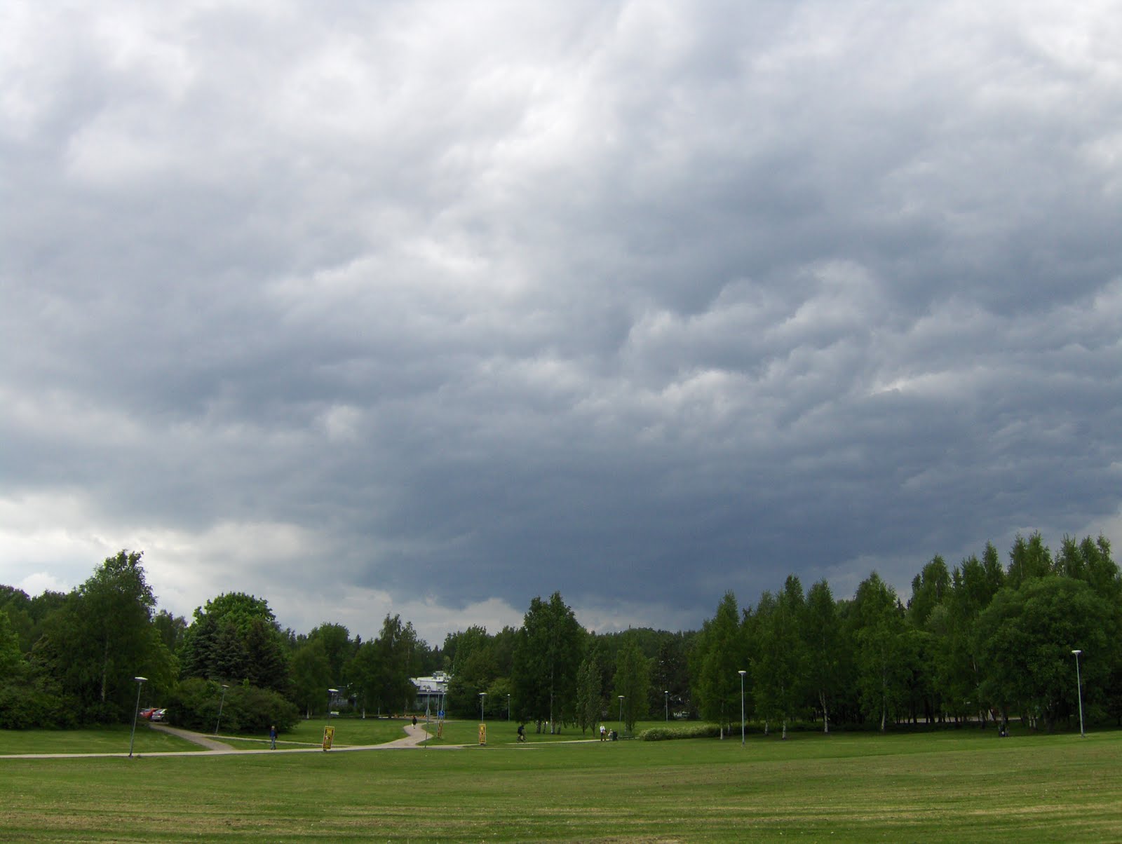 Kumpukerrospilvikantta seassaan heikkoja vesikuuroja koillisnäkymässä illansuussa kuvattuna lauantaina 5.6.2010 Jyväskylän Viherlandiassa. Idän matalapaineen ja lännen-lounaan korkeapaineen välillä kolea ja navakan puuskainen pohjois-luoteistuuli alkoi vähitellen heiketä ja kääntyä enemmän luoteeseen. Etelä-Suomeen verrattuna tällä Keski-Suomen paikalla erona olivat ko. vesikuurot (Ei etelässä) ja päivälämpötila pysyi vain +10 asteen tienoilla (Etelässä +12 ja +15 asteen välillä). Heikkoja vesikuuroja riitti myöhäisiltaan ja yöksi pilvilautat hajosivat hajanaisiksi hahtuvapilvilautoiksi.